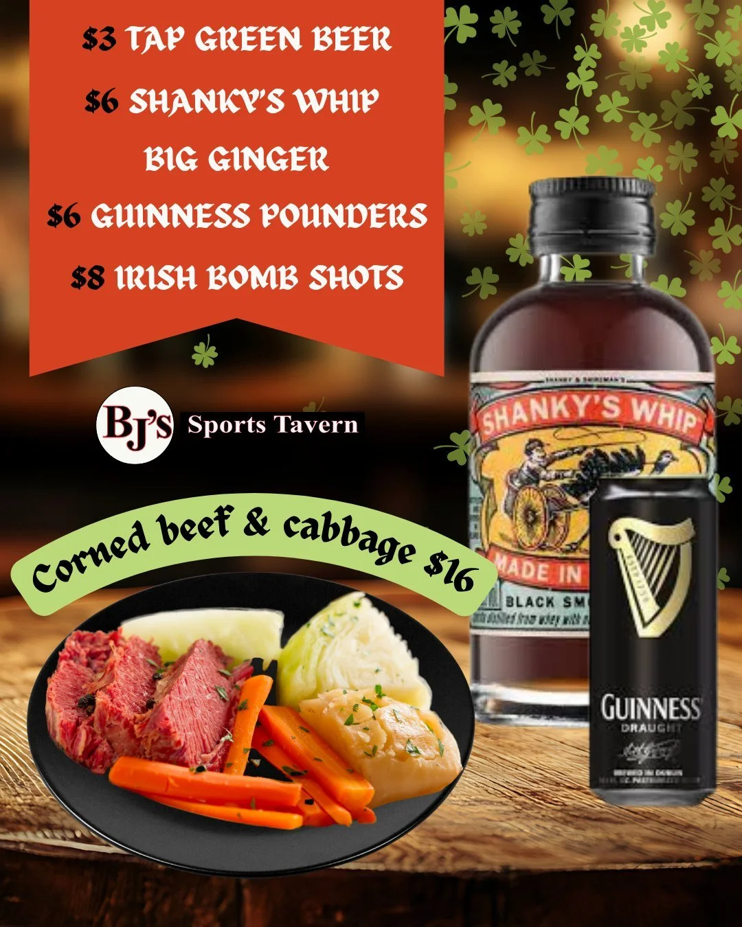 St. Patrick’s Day Drink Specials ($3 Tap Green Beer, $6 Shanky’s Whip Big Ginger, $6 Guinness Pounders, $8 Irish Bomb Shots)